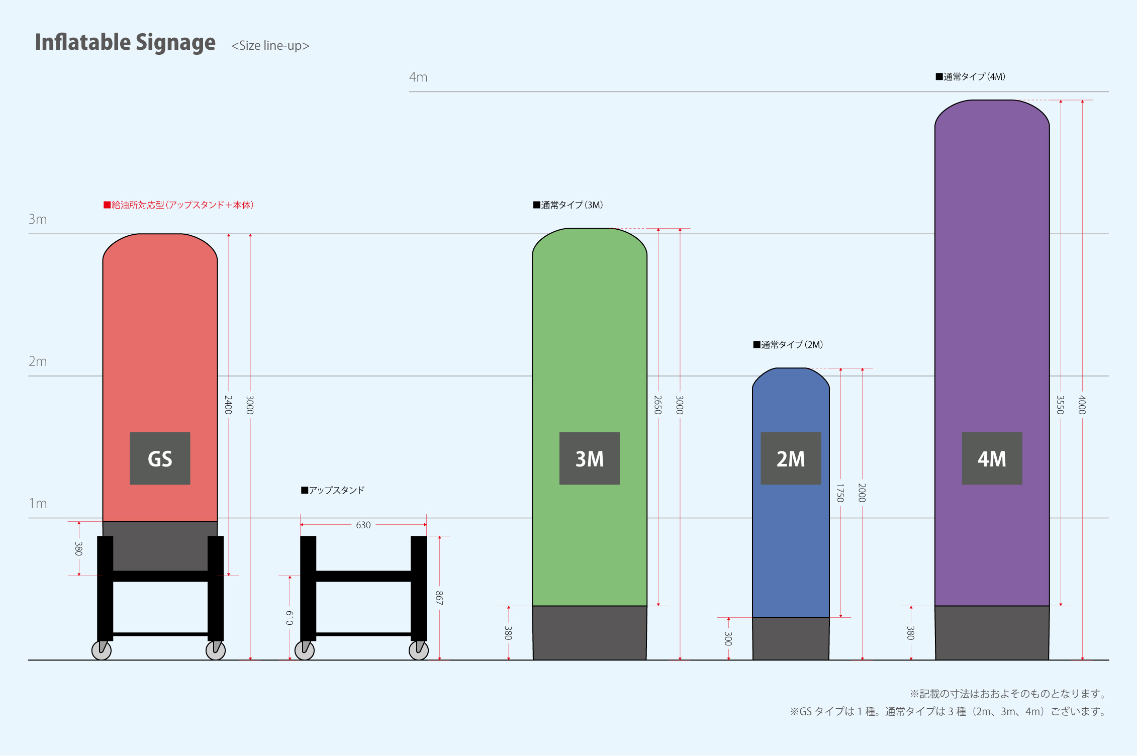 独自開発のアップスタンドで高さ60cmを確保し「防爆規制エリア内設置」を実現しました。耐油車輪付きなので一人での移動も楽々。車輪の直径はサービスステーションの排水溝を考慮した12cmで、脱輪しにくく(排水溝に垂直に侵入した場合)なっています。アップスタンドにインフレータブルサイネージ(GSタイプ)をセットして使用した際の全高が約3mになります。