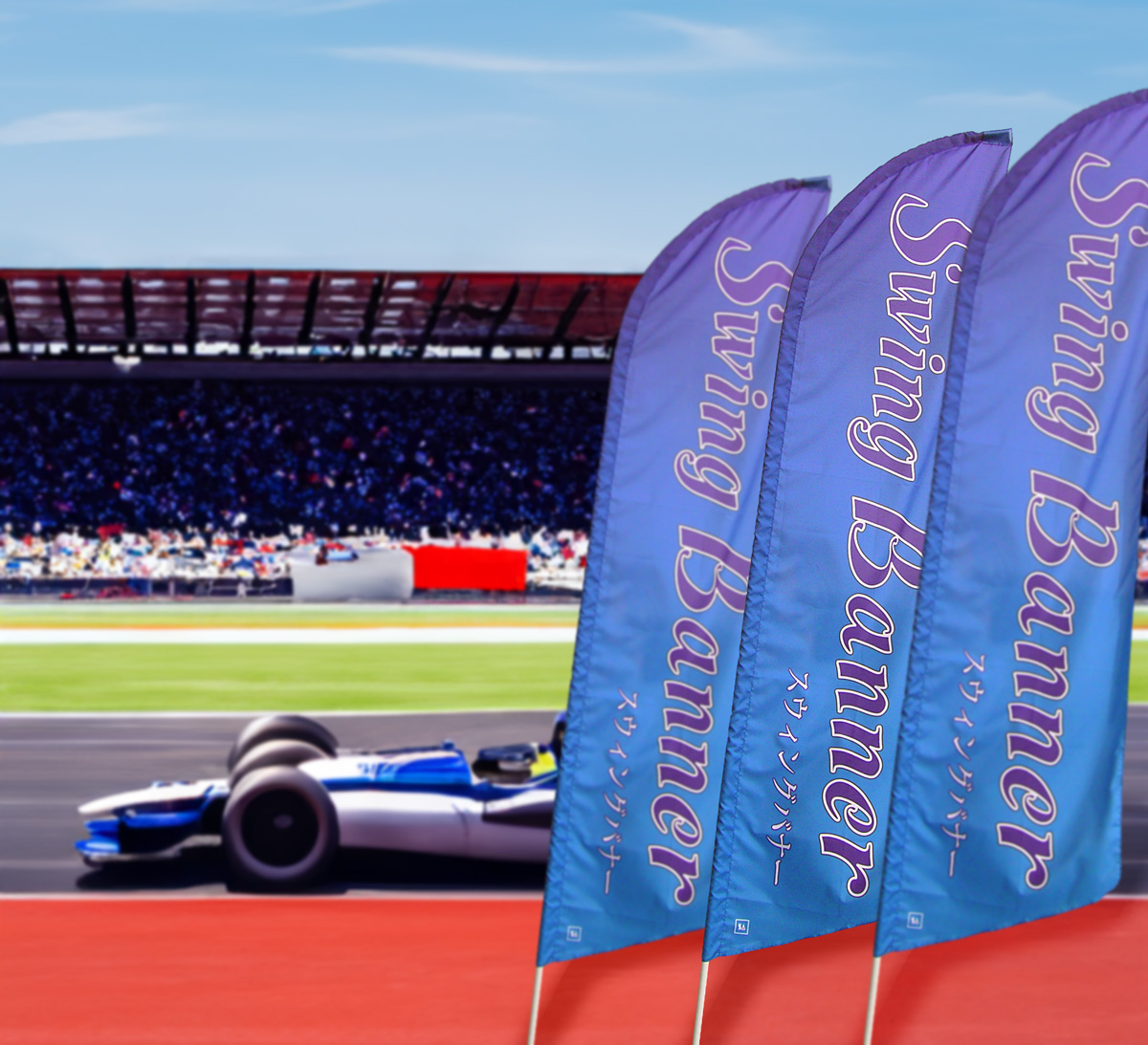 スウィングバナー®の製作実績としてはアミューズメント店、カーディーラー(ブランドロゴや新車告知)、カフェ・レストラン(店名ロゴや新メニュー)などといった店頭告知用途のほか、イベント会場、レース・サーキット場などでの会場装飾などもございます。のぼり旗と同じ生地(ポンジ)を使用しており、軽量でコンパクトに収納でき、看板等に比べ、設置、撤去も簡単なため、会場を盛り上げるツールとして最適です。